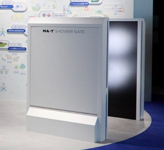 MA-T(R)シャワーゲートを展示します。MA-T(R)液剤を散布することにより、通過されるお客様の衣服などを清潔にするMA-T(R)のシャワーゲートです。
