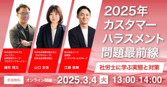 株式会社DONUTS(東京都渋谷区、代表取締役:西村 啓成)が提供するバックオフィス支援クラウドERPシステム「ジョブカン」は、SATOグループ日本社会保険労務士法人、株式会社シンカと共催で、カスハラの実態から具体的な対策、対応までの一連の流れを学ぶオンラインセミナー「2025年カスタマーハラスメント問題最前線~社労士に学ぶ実態と対策~」を2025年3月4日(火)に開催します。