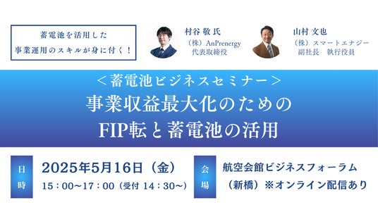 太陽光発電所の運営・保守事業において国内最大手(※)の株式会社スマートエナジー(東京都港区 代表取締役 大串卓矢、以下スマートエナジー)は株式会社AnPrenergy(東京都港区 代表取締役 村谷 敬、以下AnPrenergy)との共催で、蓄電池ビジネスセミナー『事業収益最大化のためのFIP転と蓄電池の活用』を2025年5月16日(金)より開催します。
