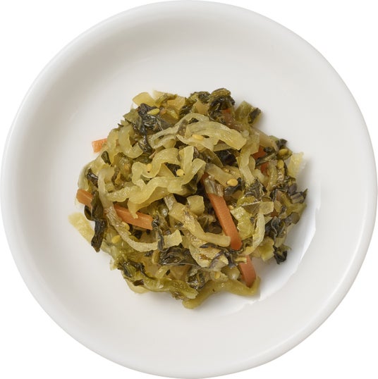 旨味あふれる高菜の漬物、カリカリ食感がアクセントになる大根、味だけでなく色味もよい人参。3種の食材にごまを加え、よくほぐして混ぜ合わせ、絶妙なバランスの調味料で仕上げました。箸休めにもぴったりのおいしさです。