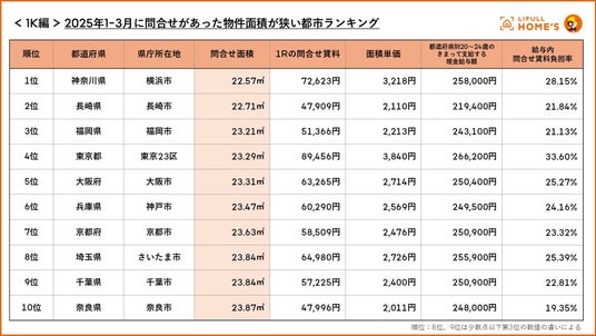 東京23区をはじめ全国の単身向け間取り(ワンルーム、1K)物件のニーズの地域差があるのか、2025年の1~3月にLIFULL HOME'Sに掲載した物件への問合せがあった物件面積、問合せ賃料を東京23区と県庁所在地のある市ごとに調べました。