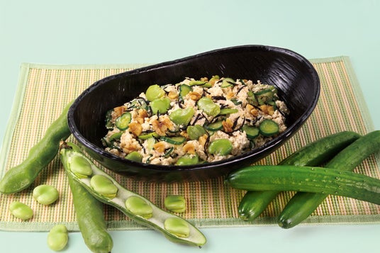 豆富の白和えに、空豆、ひじき、きゅうり、クルミとツナを合わせました。豆乳出汁と西京味噌で深い味わいの白和えに仕上がりました。