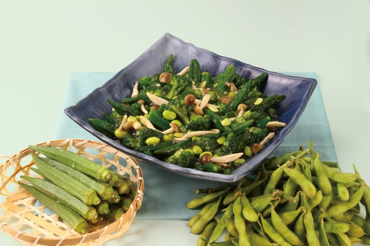 オクラ、ブロッコリー、しめじ、枝豆をだし醤油のあんで味付けしました。さっぱりとした味わいで、清涼感のある一品です。