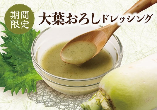 ドレッシングも期間限定で、「大葉おろしドレッシング」が新登場です。大葉と大根おろしの風味が食欲をそそります。色々なサラダにかけてお召し上がりください。
