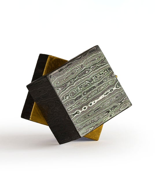 自作したダマスカス鋼の波状模様と端正な造形が織りなす世界を創作する加藤貢介氏。