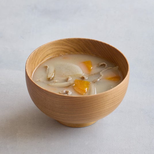 「ありこだし」と「島原の子守みそ」、「平田牧場」の三元豚と新鮮な根菜を贅沢に使用した優しい味わいの豚汁。