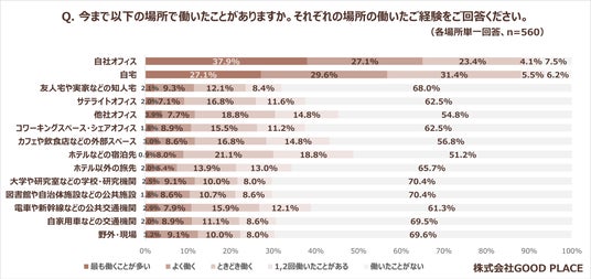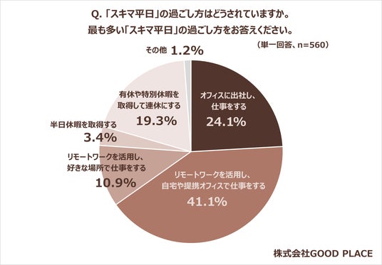 建物のリノベーション、オフィス構築、バックオフィス業務のアウトソーシングを通じて「より良い場」を創造する建築会社の株式会社GOOD PLACE(旧株式会社コスモスモア、本社:東京都渋谷区、代表取締役社長:枝廣 寿雄)は、月に1回以上リモートワークをする一都三県在住20~60代の会社員560名を対象に、「スキマ平日と働く場に関する調査」を実施しました。