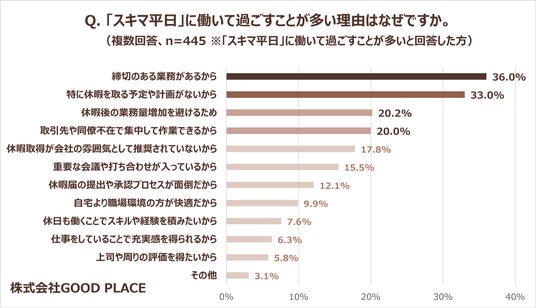 前の質問で“スキマ平日”に働いて過ごすことが多いと回答した人に働く理由を尋ねたところ、最も多かったのは「締切のある業務があるから(36.0%)」。次いで「特に休暇を取る予定や計画がないから(33.0%)」が続きました。「やるべき仕事がある」「休暇を取る必要がない」といった回答から、意欲的に勤務しているというより業務上の都合や予定に合わせて働く選択をとっている人が多いことが読み取れます。