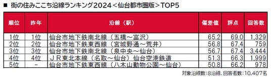・「街の住みここち沿線ランキング2024<仙台都市圏版>」は、仙台都市圏の居住者を対象に、2020年~2024年の5年分の回答を累積し、回答者数50名以上の沿線をランキング対象として集計しています。