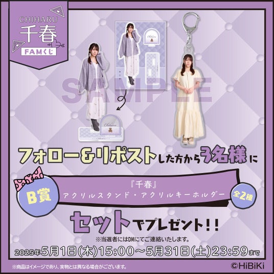 期間中に「FAMくじオンライン」の公式Xアカウント(@FAMKUJI_ONLINE)をフォローし、キャンペーン投稿をリポストすることで、抽選で3名様にB賞の「アクリルスタンド・アクリルキーホルダー」をプレゼントいたします。