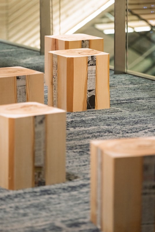 古くから良材の産地として名高い奈良県吉野でとれる「吉野杉」に着目した本プロジェクトの第一フェーズとして、館内レストスペースには吉野杉のファニチャーが、屋上庭園にはアートパークが登場します。■吉野杉の原木の魅力を伝えるファニチャーが登場