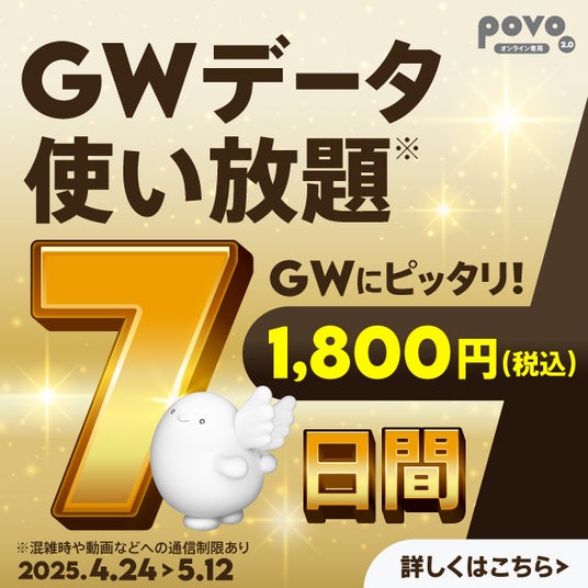 povo、ゴールデンウィークキャンペーン第1弾で1年間トッピング割引や「GWデータ使い放題(7日間)」などを提供