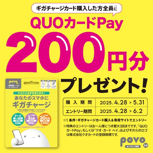 2025年4月28日から5月31日まで、全国のローソンでギガチャージカードを購入するとQUOカードPay200円分がもらえるキャンペーンを開催します。「使い放題(24時間)330円」「3GB(30日間)990円」「20GB(30日間)2,700円」すべてが対象のおトクなキャンペーンです。