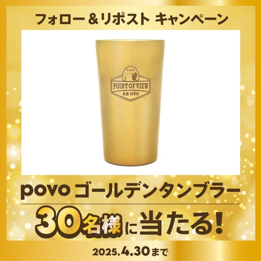 4月24日にpovoの公式Xで実施するフォロー&リポストキャンペーンで、抽選で30名にpovoオリジナルのゴールデンタンブラーをプレゼントします。いつもの飲み物が少し特別に感じられる高級感のある金のタンブラーです。