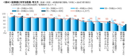 配偶者への意見・考え方を4段階で聴取した。非常に+まあそう思う割合は、「夫婦といえども、精神的には自立した関係でいたい」84%、「生涯、添い遂げようと思う」82%が多く、「配偶者に対していつも感謝の気持ちを持っている」「友達のような対等な夫婦がいい」「今の配偶者と結婚をして、幸せだと感じる」「配偶者は自分にとって心の支え」と続く。上位にあがった項目は、年代による大きな差は見られない。若い世代ほど「配偶者にはフルタイムで仕事をしてほしい」「結婚記念日はお祝いをしている」「お誕生日など夫婦間でプレゼントを贈っている」の割合が高まる。<図4>