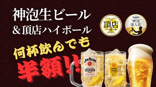 創作海鮮居酒屋「涛司(トウジ)」では、サントリー認定“神泡達人店”&“頂店ハイボール”のW称号獲得を記念し、ゴールデンウィーク期間限定で対象ドリンクが何杯飲んでも【半額】になるキャンペーンを開催中です
