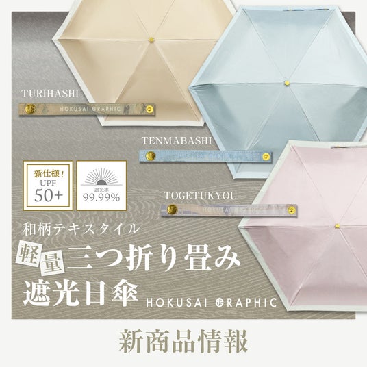 和心の和傘・和柄傘ブランド『北斎グラフィック』から、機能性と軽量さを兼ね備えた「折り畳み遮光日傘」が登場