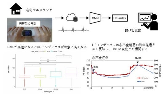 これにより、従来、植込み型心臓電気デバイス(CIED、注1)に依存していた心不全の在宅モニタリングが、スマートウォッチを含む携帯型心電計で計測できる単一誘導心電図データのみを用いてできるようになり、心不全の進行を早期に検出することが可能になりました。さらに、AIによる独自の「HF(Heart failure)インデックス(注2)」を開発し、心不全の重症度を数値化する新たな指標を確立しました。このようなアプローチによる心不全のリアルタイム評価システムの報告はこれまでになく、心不全管理のより良い医療を提示するものです。