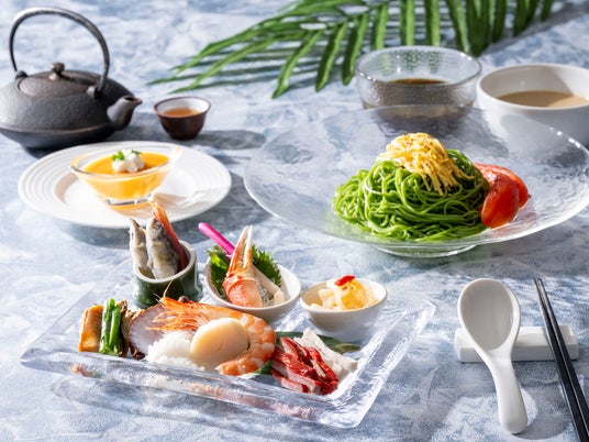 暑い夏、眼下に広がる青い海と横浜港の景色を眺めながら、ホテルのモダンなメインダイニングで夏限定のご馳走「特選海鮮盛り 冷やし翡翠麺」を心ゆくまでご堪能ください。