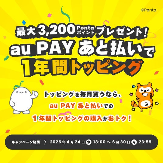 KDDI、沖縄セルラー、auフィナンシャルサービスは、2025年4月24日から、スマートフォンから簡単に申し込みができるバーチャルカード型の決済サービス「au PAY あと払い」に新規入会し、au PAY あと払いでpovo2.0のトッピングを購入すると最大3,200Pontaポイントをプレゼントする「au PAY あと払い新規入会×povo2.0トッピング購入キャンペーン!」(以下 本キャンペーン)を実施します。