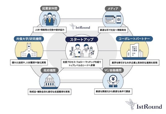 「1stRound」では、過去8年半、累計93チームを採択し、会社設立・資金調達を支援してまいりました。支援後1年以内の資金調達成功率は約90%以上、大型助成金の採択率50%以上を達成しております。また、コーポレートパートナーを中心とする大手企業との協業関係の創出にも注力しており、各回半数を超えるチームが協業に至っております。採択企業とコーポレートパートナーをはじめとする様々なステークホルダーを繋げ、双方の知見を活かしたより良いスタートアップ創出のためのコミュニティの醸成とともに、技術シーズを活用したスタートアップビジネス促進の加速を目指します。