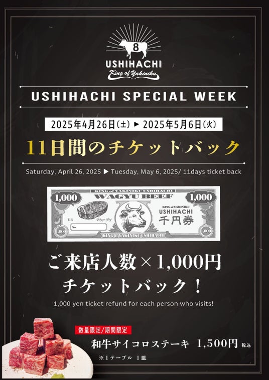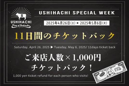 株式会社Brand Bank Company(本社:東京都新宿区西新宿、代表取締役社長:根本 寿一)の運営する焼肉店「USHIHACHI」は、2025年4月26日(土)よりGW期間限定で『チケットバック』を実施いたします。