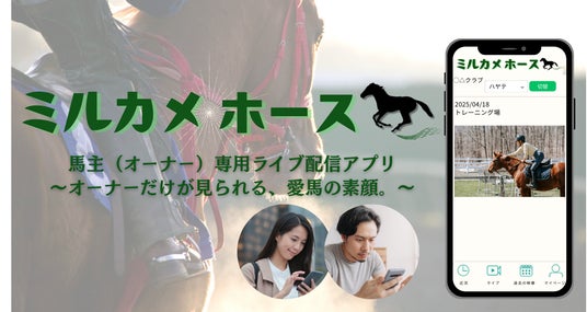 ミルカメホース愛馬の様子をスマートフォンからリアルタイムまたはアーカイブで確認できる“見守り”配信アプリです。まるで愛馬がそばにいるような安心感と喜びを提供します。