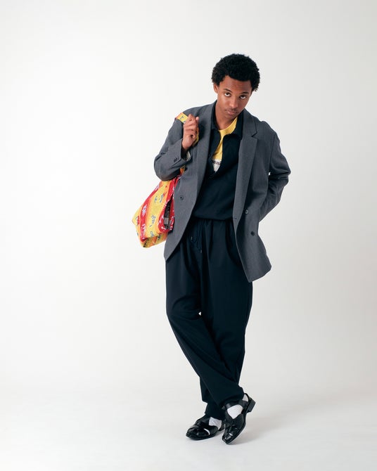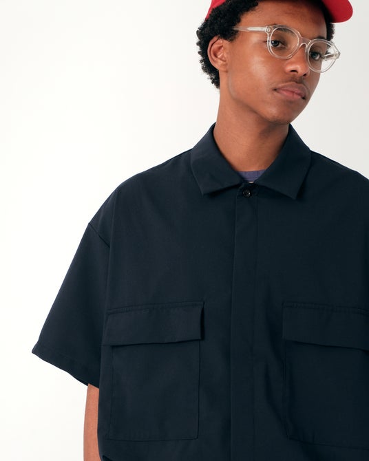 ブランドらしいゆったりとしたシルエット、大きなフラップポケットからワークテイストを感じつつ、ポリエステルとレーヨン混紡のファブリックによって、エレガントな一面も持ち合わせています。
