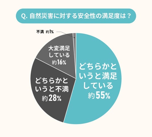 自然災害に対する安全性については「どちらかというと満足している」が約50%で最多となりましたが、「どちらかというと不満」も約30%と比較的多い結果となりました。