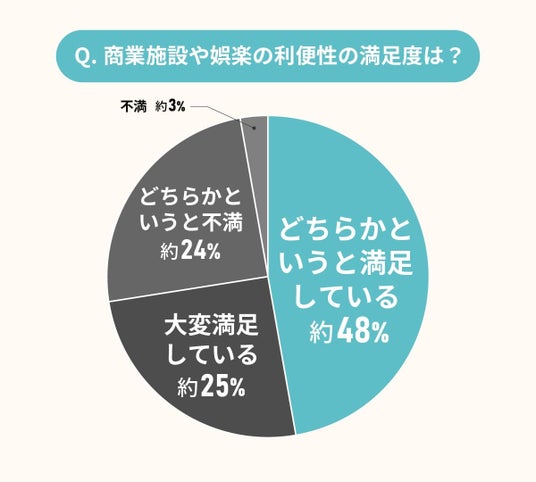 商業施設や娯楽の利便性については、「どちらかというと満足している」が約55%と最も多い結果となりました。