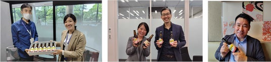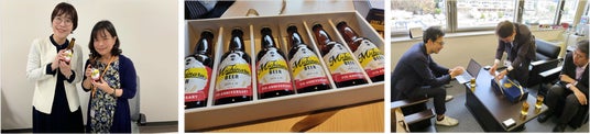 写真左:michinaru 取締役 横山・イーソル株式会社 澤田様 / 中央:オリジナルラベルの5周年ビール / 右:株式会社ジャパンテクニカルソフトウェア 代表取締役社長 清水様・松浦様