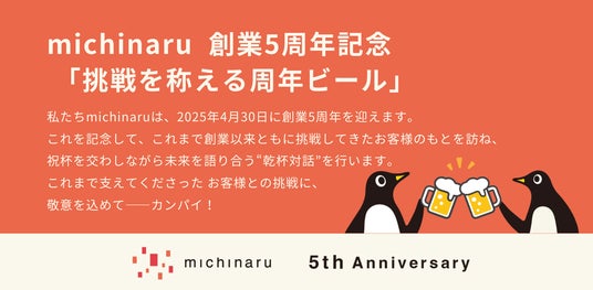 成熟企業の新規事業人材を育成するmichinaru株式会社(本社:東京都千代田区、代表取締役 菊池 龍之)は、2025年4月30日に創業5周年を迎えます。これを記念して、成熟企業で事業創造や組織変革に取り組むお客様へ感謝を込めた「挑戦を称える周年ビール」を制作。創業以来ともに挑戦してきたお客様のもとを訪ね、祝杯を交わしながら未来を語り合う“乾杯対話”を行います。