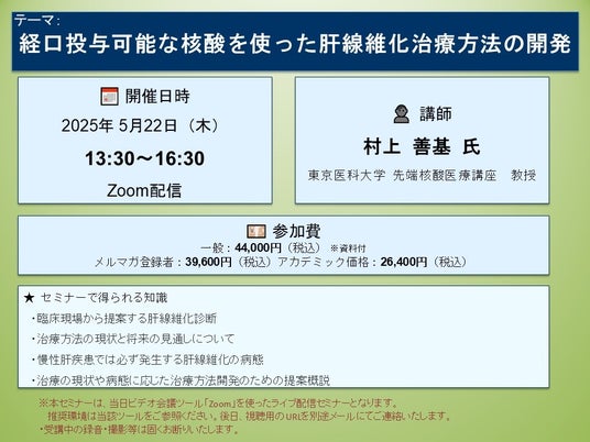 先端技術情報や市場情報を提供している(株)シーエムシー・リサーチ(千代田区神田錦町: https://cmcre.com/ )では、 各種材料・化学品などの市場動向・技術動向のセミナーや書籍発行を行っておりますが、 このたび「経口投与可能な核酸を使った肝線維化治療方法の開発」と題するセミナーを、 講師に村上 善基 氏 (東京医科大学 先端核酸医療講座 教授)をお迎えし、2025年5月22日(木)13:30より、 ZOOMを利用したライブ配信で開催いたします。 受講料は、 一般:44,000円(税込)、 弊社メルマガ会員:39,600円(税込)、 アカデミック価格は26,400円(税込)となっております(資料付)。