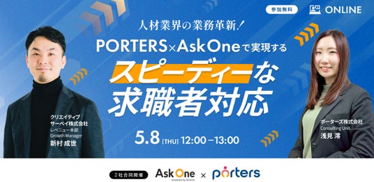 人材ビジネス向けマッチングシステムを提供するポーターズ株式会社(東京証券取引所グロース. 証券コード5126、東京都港区、代表 西森 康二、以下 ポーターズ)は、クリエイティブサーベイ株式会社(以下、クリエイティブサーベイ)と共同で「人材業界の業務革新!PORTERS × Ask Oneで実現するスピーディーな求職者対応」セミナーを2025年5月8日(木)12:00~オンラインで開催いたします。