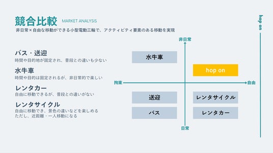 沖縄・西表島に本社を構えるhop onは、電動小型モビリティの開発・レンタルを行っています。主に西表島を訪れる観光客に向けて、自由で非日常感のある移動手段を提供します。