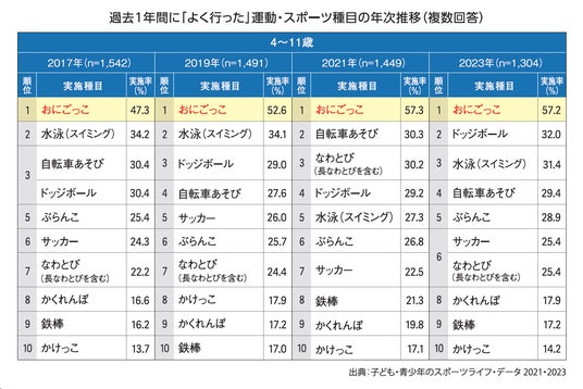 子どもたちの運動能力低下が危惧される中、体力向上を担うスポーツとして、“鬼ごっこ”が注目され始めています。毎年出生率が低下する一方で、4~11歳がよく行った運動・スポーツに関するアンケートでは、“鬼ごっこ”は毎年圧倒的多数で1位を獲得し、その実施率も数年前と比較して増加傾向にあります。(出典:子ども・青少年のスポーツライフ・データ)