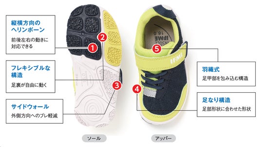子ども自身での履きやすさに配慮した「アウトサイドストラップ」や、子どもの健やかな足の成長を育むインソール「ウィンドラスソーサー (R)」など IFME のオリジナル機能を搭載しています。