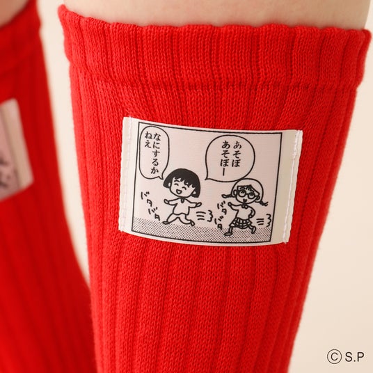 原作マンガの一コマをプリントネームタグで表現。ベースのアメリブソックスは、まるちゃん・たまちゃんのお洋服をイメージした配色になっています。