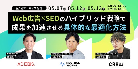 【5/7,12,13無料】「Web広告×SEOのハイブリッド戦略で成果を加速させる具体的な最適化方法」再放送決定!当社はSEOに関するテーマで参加いたします。