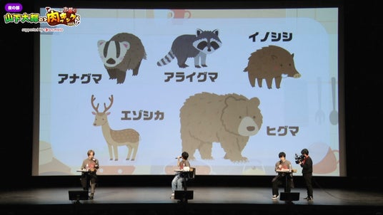 昼の部に続き「おにクイズ“珍肉番付”」のコーナーで用意された肉はイノシシ、エゾシカ、アライグマ、アナグマ、ヒグマの5種類。クマ系の登場に会場からは悲鳴に似た声も挙がるなか、「斜め上からの生ハム」や「地べたを這いずり回る生ハム」「やせーーい(野生)!」など、食べた後の表現も独特な肉の連続に視聴者からは「初めて見る表情してる」「クマ勢w」「しんどそうな顔したなwww」など様々なコメントが寄せられました。3人の回答が割れる中、なんと適当に答えた畠中が全問正解という展開に。優勝は畠中、最下位は山下と蒼井の2人だったため、罰ゲームのスイーツを一緒に食べることに。