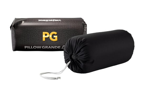 今回の「ピローグランデ ブラック」が、マニフレックスの枕としては初めて紙パッケージを実現。従来のダンボール化粧箱に比べて廃棄するゴミの量を大きく削減しています。クルクル丸めて収納できる便利なキャリングケース付き。