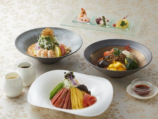 美しく盛りつけられた具材で涼やかさを演出する“五目冷やし麺”は、開業以来受け継がれる伝統のレシピで仕込む“醤油ダレ”か“胡麻ダレ”をお選びいただけます。“冷やし担々麺”は、牛肉そぼろとトマト、ズッキーニなどの野菜とともに、豊かな胡麻の香りが広がるピリッと辛味の効いたタレでお楽しみいただける一品です。