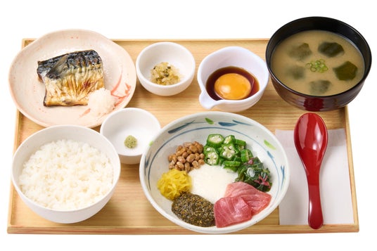 『アカモクねばとろ定食』は、ねばねば食材の納豆・とろろ・オクラとまぐろや海藻サラダ、刻みたくあんなどさまざまな食感と味わいを一皿に盛り込み、見た目にも鮮やかで食欲をそそります。召し上がる際は、たっぷりの具材に卵黄とだし醤油をかけて豪快にまぜていただくのがおすすめ。それぞれの素材が混ざり合うことで、まろやかさと旨みが引き立ち、最後の一口まで飽きのこない味わいを楽しめます。