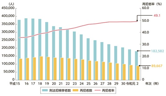 日本では出所後に就職しにくいことも大きな原因の一つとなって、2020年の再犯率は49.1%に上ります。(右図参照:法務省「再犯防止推進白書」より)
