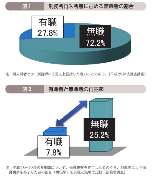 法務省の調査によって、有職と無職の再犯率には大きな差があることがわかっています。(左図参照:法務省「再犯防止推進白書」より)同社では、出所者の仕事を作ることで日本の再犯率の改善を目指します。また、ただ機会的に仕事を与えるのではなく、出所者も日本の大切な働き手の一人と捉えて、一人一人が力を発揮できる環境を整えていきます。