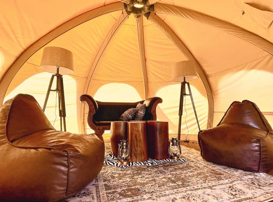 オートエリア内の「グランピング席」では、手軽にグランピング気分も楽しみながら、広々とした空間でバーベキューが堪能できます。「屋根付きカバナテラス」、「WEBER社製大型ガスグリル」、「ドーム型のラグジュアリーテント」を完備した贅沢なサイトです。