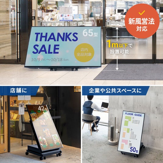 サイネージスタンドは新風営法に対応したロータイプで、店舗サイネージやインフォメーション用として最適です。