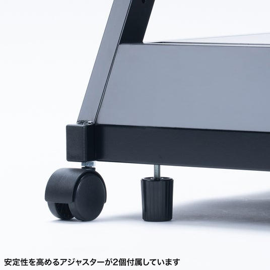 直径50mmのキャスター付きです。後輪にはストッパー付きで、しっかりと固定することも可能です。アジャスターが2個付属。取り付けることでより安定性の高い設置が可能です。
