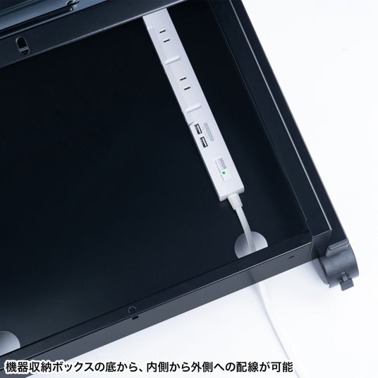 収納ボックス付きなので、小型STBやタップ、掃除用具グッズなどをすっきり収納できます。別売の鍵も取り付けられ、大切な機器を安全に保管できます。