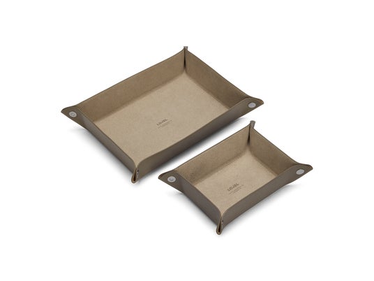 デスクトレー(大/小) ― シンプルなレザー製の整理トレイ。スマートフォンやケーブルなどの大きなアイテムから、ジュエリーやキーリングなどの小さなアイテムまで、すっきりと収納できます。四隅のスナップボタンを留めることで組み立てが可能で、折りたたんで持ち運ぶこともできます。 大:12,100円(税込) 小:9,900円(税込)